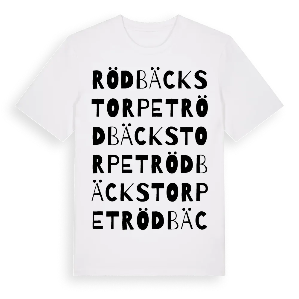Rödbäckstorpet ordlek t-shirt är inspirerad av Rödbäckstorpet i Gävleborgs län, Sverige. Tröjan är designad för dig som har en speciell koppling till platsen – oavsett om du bor här, har rötterna här eller bara älskar Rödbäckstorpet.