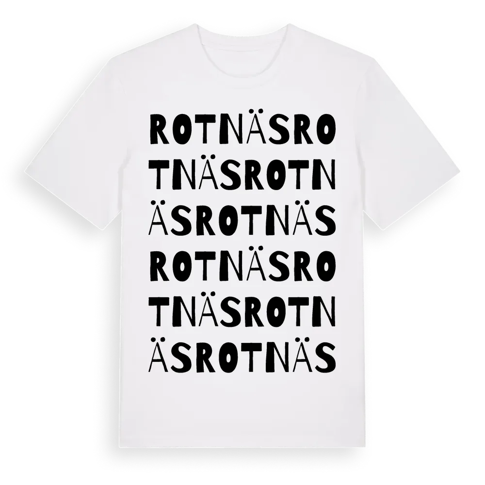 En ordlek byggd på Rotnäss namn. Subtilt och klurig – ett motiv som bara de som verkligen känner platsen fullt ut förstår. Premium bomull, unisex – från byn Rotnäs i Gävleborgs län.