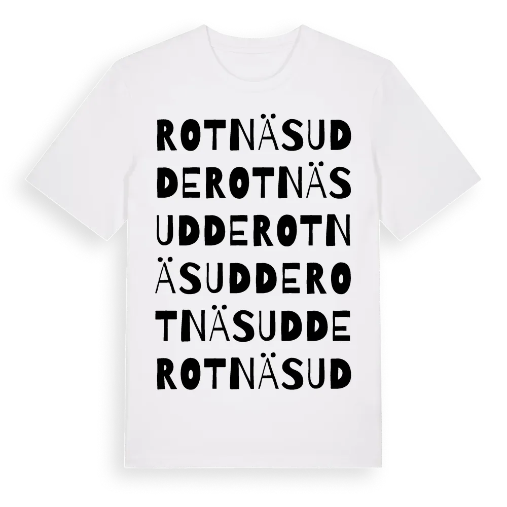 Rotnäs Udde ordlek t-shirt är inspirerad av Rotnäs Udde i Gävleborgs län, Sverige. Tröjan är designad för dig som har en speciell koppling till platsen – oavsett om du bor här, har rötterna här eller bara älskar Rotnäs Udde.