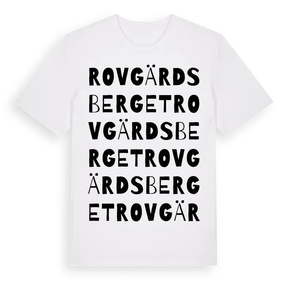 Rovgärdsberget ordlek t-shirt är inspirerad av Rovgärdsberget i Gävleborgs län, Sverige. Tröjan är designad för dig som har en speciell koppling till platsen – oavsett om du bor här, har rötterna här eller bara älskar Rovgärdsberget.