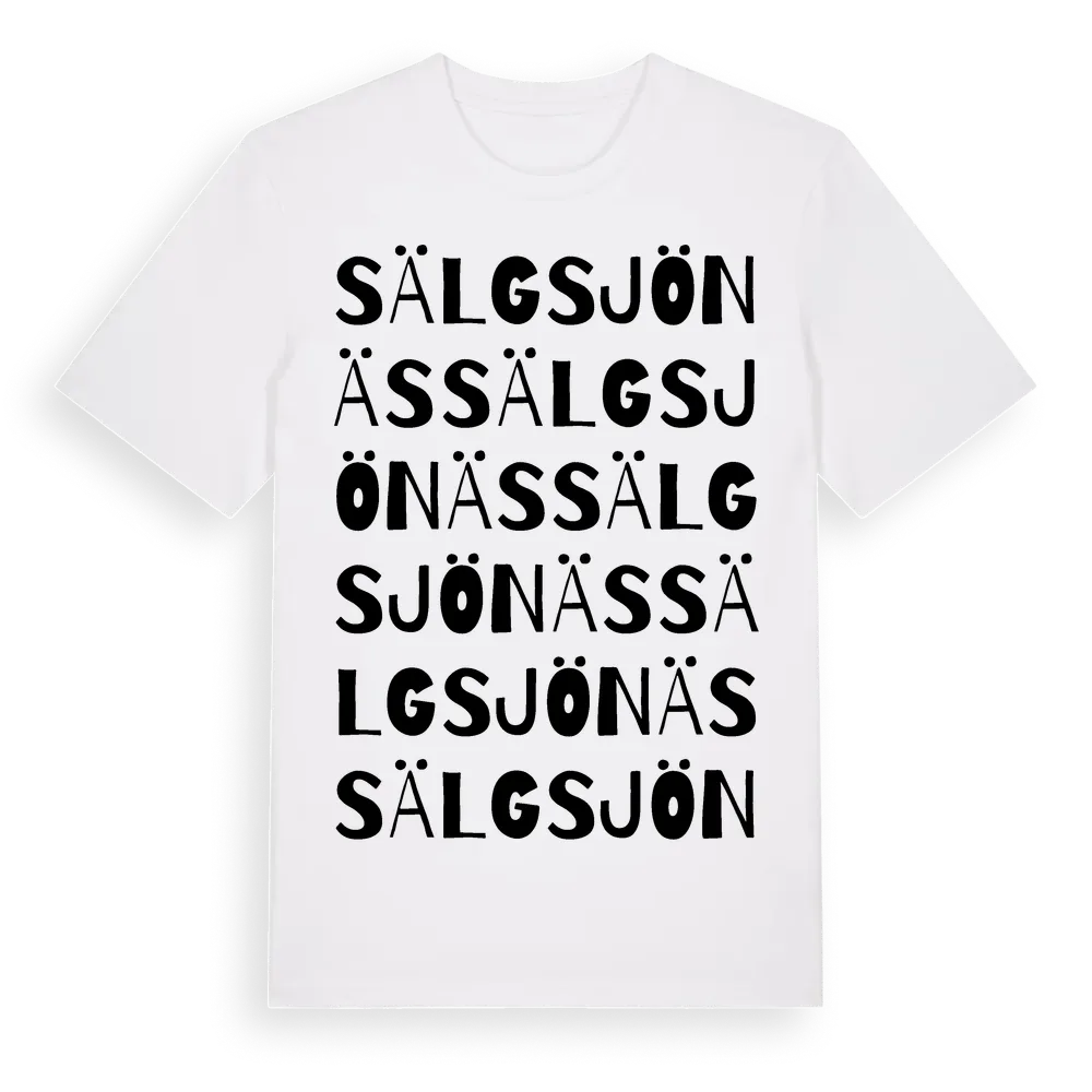 Sälgsjönäs ordlek t-shirt är inspirerad av Sälgsjönäs i Gävleborgs län, Sverige. Tröjan är designad för dig som har en speciell koppling till platsen – oavsett om du bor här, har rötterna här eller bara älskar Sälgsjönäs.