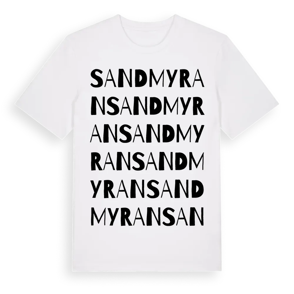 Sandmyran ordlek t-shirt är inspirerad av byn Sandmyran i Gävleborgs län, Sverige. Tröjan är designad för dig som har en speciell koppling till platsen – oavsett om du bor här, har rötterna här eller bara älskar Sandmyran.