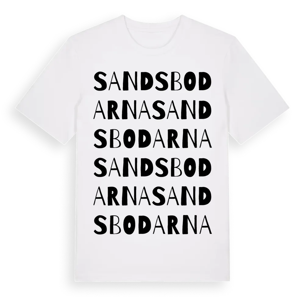 Sandsbodarna ordlek t-shirt är inspirerad av Sandsbodarna i Gävleborgs län, Sverige. Tröjan är designad för dig som har en speciell koppling till platsen – oavsett om du bor här, har rötterna här eller bara älskar Sandsbodarna.