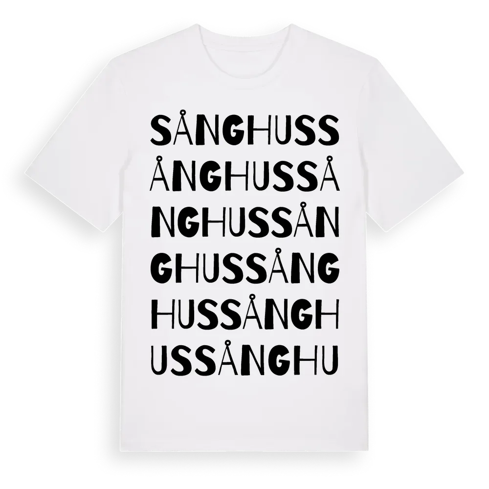Sånghus ordlek t-shirt är inspirerad av byn Sånghus i Gävleborgs län, Sverige. Tröjan är designad för dig som har en speciell koppling till platsen – oavsett om du bor här, har rötterna här eller bara älskar Sånghus.