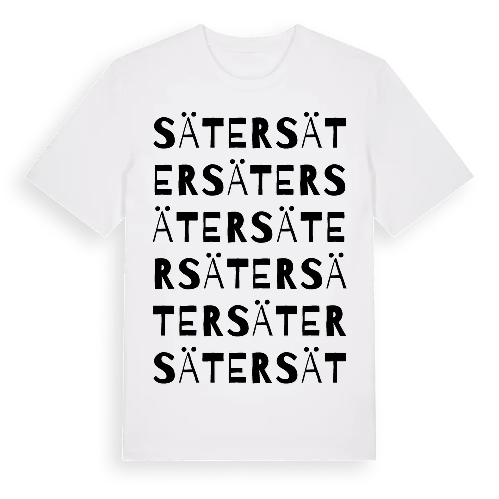 Säter ordlek t-shirt är inspirerad av byn Säter i Gävleborgs län, Sverige. Tröjan är designad för dig som har en speciell koppling till platsen – oavsett om du bor här, har rötterna här eller bara älskar Säter.