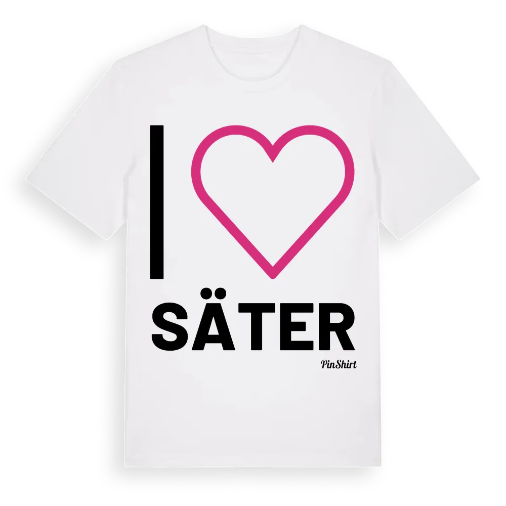 Jag älskar Säter t-shirt stort tryck är inspirerad av Säter i Gävleborgs län, Sverige. Tröjan är designad för dig som har en speciell koppling till platsen – oavsett om du bor här, har rötterna här eller bara älskar Säter.