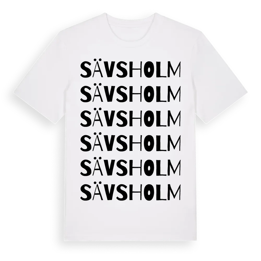 Sävsholm ordlek t-shirt är inspirerad av byn Sävsholm i Gävleborgs län, Sverige. Tröjan är designad för dig som har en speciell koppling till platsen – oavsett om du bor här, har rötterna här eller bara älskar Sävsholm.