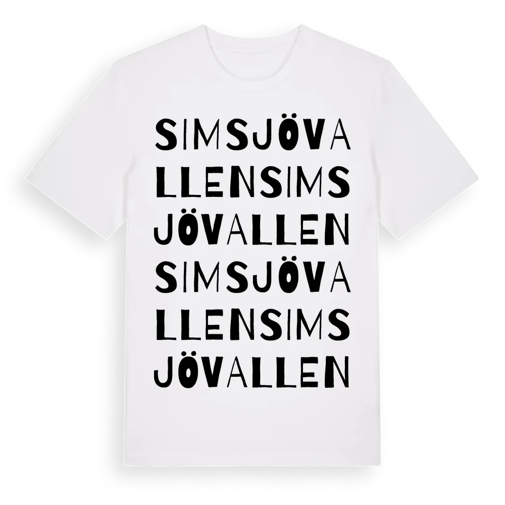 Simsjövallen ordlek t-shirt är inspirerad av Simsjövallen i Gävleborgs län, Sverige. Tröjan är designad för dig som har en speciell koppling till platsen – oavsett om du bor här, har rötterna här eller bara älskar Simsjövallen.