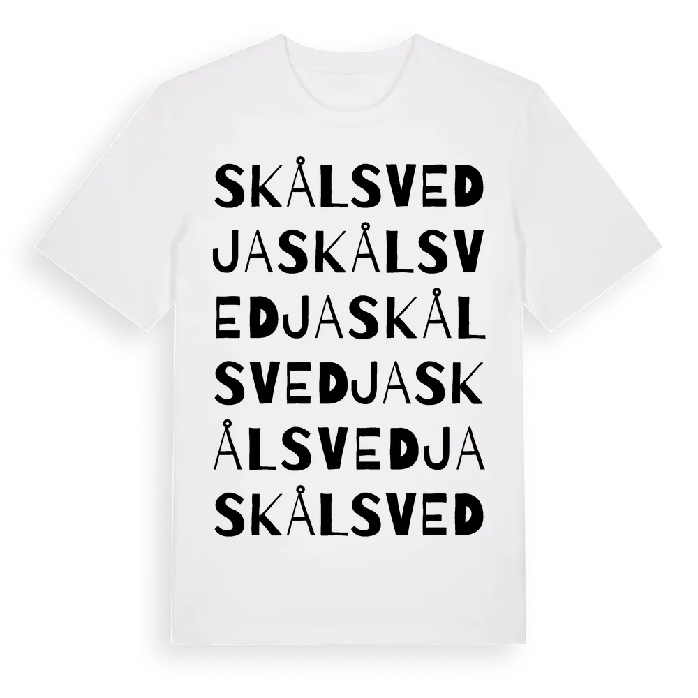 Skålsvedja ordlek t-shirt är inspirerad av byn Skålsvedja i Gävleborgs län, Sverige. Tröjan är designad för dig som har en speciell koppling till platsen – oavsett om du bor här, har rötterna här eller bara älskar Skålsvedja.
