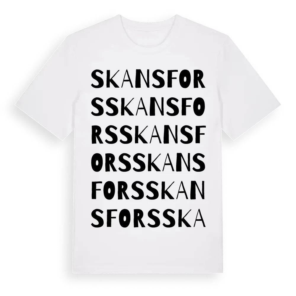 Skansfors ordlek t-shirt är inspirerad av byn Skansfors i Gävleborgs län, Sverige. Tröjan är designad för dig som har en speciell koppling till platsen – oavsett om du bor här, har rötterna här eller bara älskar Skansfors.