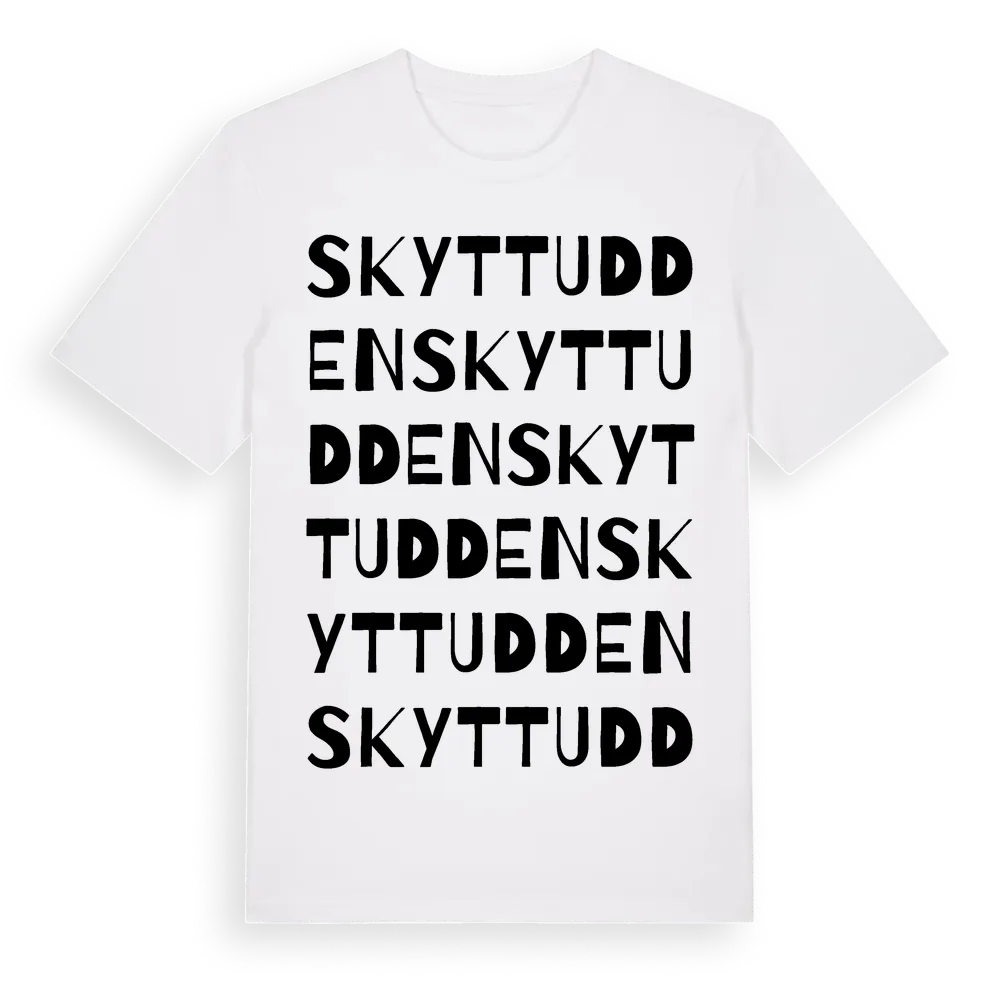 En ordlek byggd på Skyttuddens namn. Subtilt och klurig – ett motiv som bara de som verkligen känner platsen fullt ut förstår. Premium bomull, unisex – från Skyttudden i Gävleborgs län.