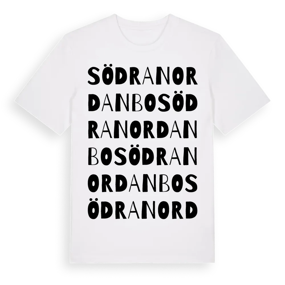 Södra Nordanbo ordlek t-shirt är inspirerad av Södra Nordanbo i Gävleborgs län, Sverige. Tröjan är designad för dig som har en speciell koppling till platsen – oavsett om du bor här, har rötterna här eller bara älskar Södra Nordanbo.