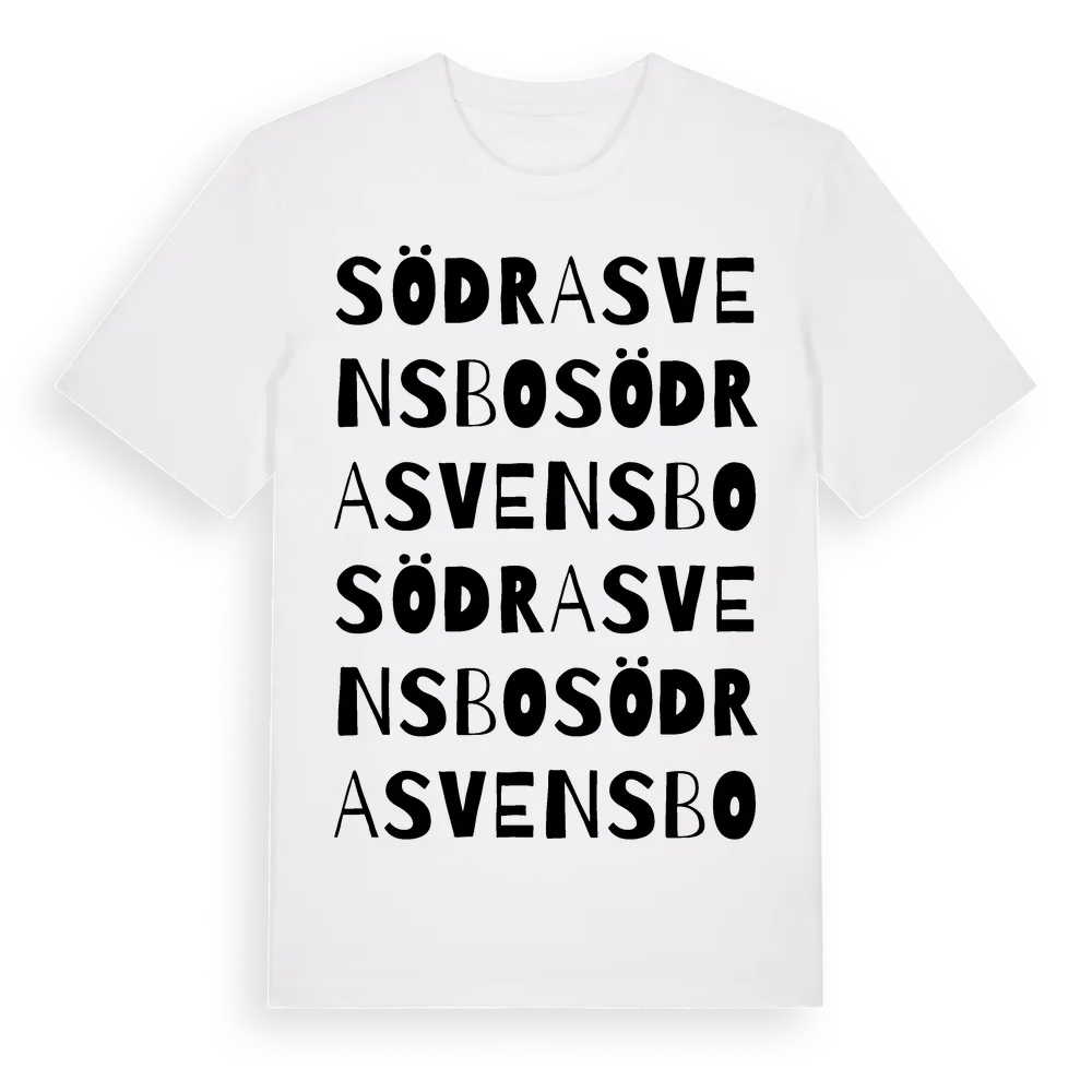 Södra Svensbo ordlek t-shirt är inspirerad av byn Södra Svensbo i Gävleborgs län, Sverige. Tröjan är designad för dig som har en speciell koppling till platsen – oavsett om du bor här, har rötterna här eller bara älskar Södra Svensbo.