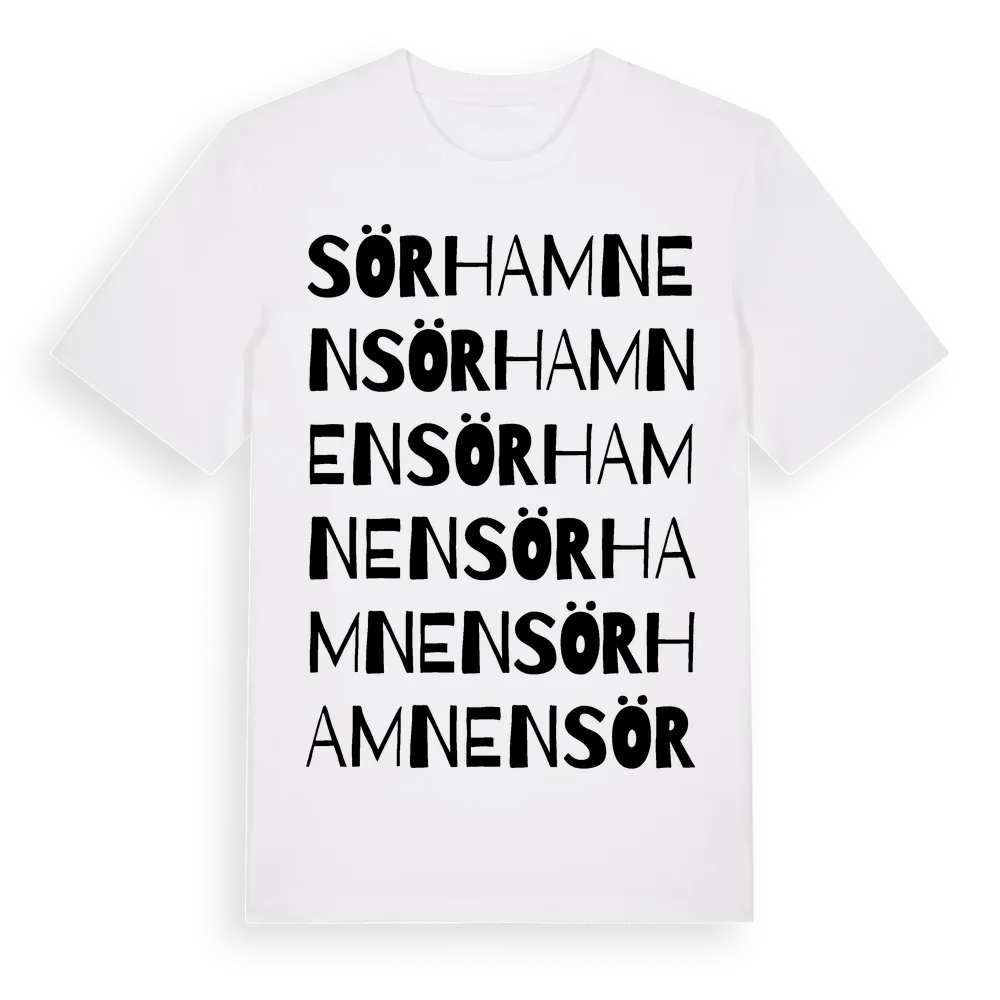 Sörhamnen ordlek t-shirt är inspirerad av byn Sörhamnen i Gävleborgs län, Sverige. Tröjan är designad för dig som har en speciell koppling till platsen – oavsett om du bor här, har rötterna här eller bara älskar Sörhamnen.