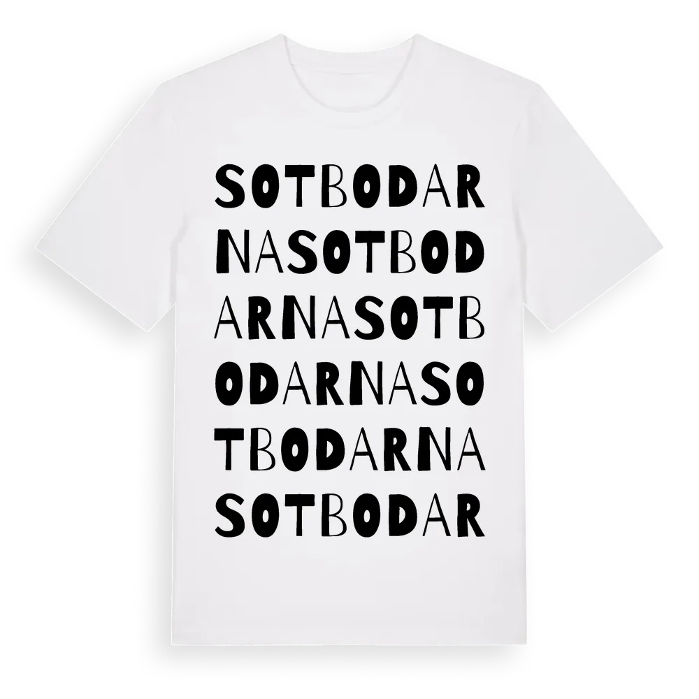 Sotbodarna ordlek t-shirt är inspirerad av Sotbodarna i Gävleborgs län, Sverige. Tröjan är designad för dig som har en speciell koppling till platsen – oavsett om du bor här, har rötterna här eller bara älskar Sotbodarna.