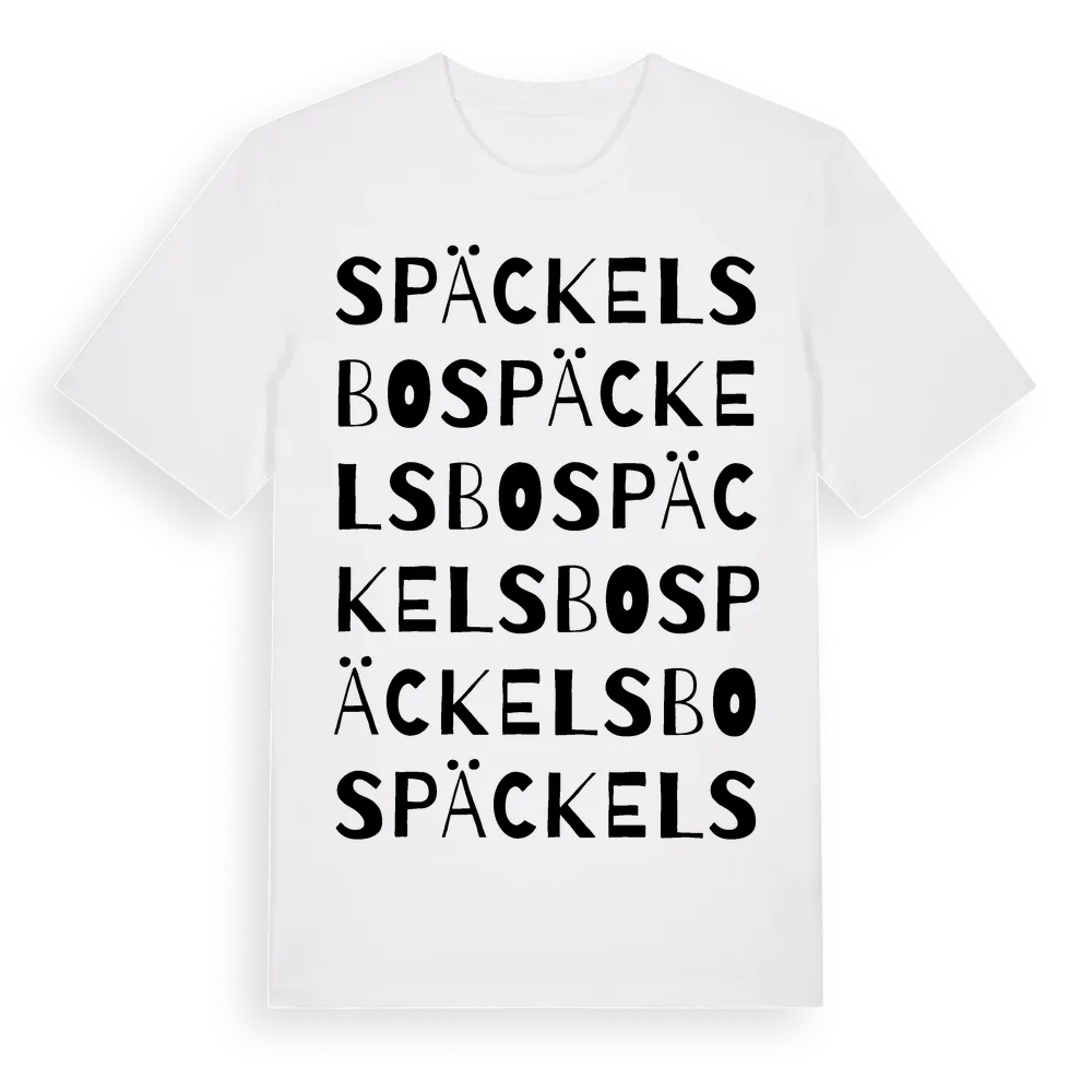 Späckelsbo ordlek t-shirt är inspirerad av Späckelsbo i Gävleborgs län, Sverige. Tröjan är designad för dig som har en speciell koppling till platsen – oavsett om du bor här, har rötterna här eller bara älskar Späckelsbo.