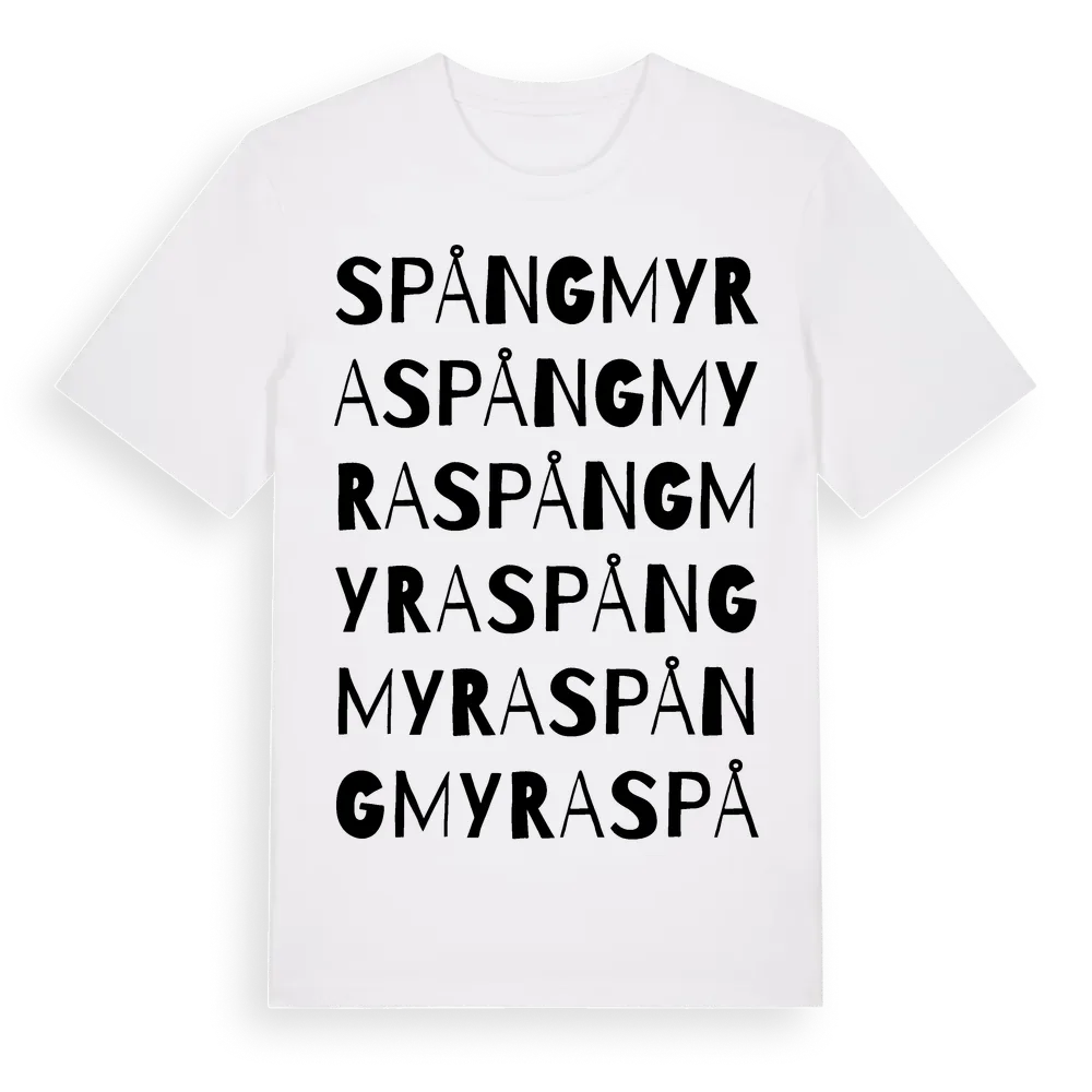 Spångmyra ordlek t-shirt är inspirerad av byn Spångmyra i Gävleborgs län, Sverige. Tröjan är designad för dig som har en speciell koppling till platsen – oavsett om du bor här, har rötterna här eller bara älskar Spångmyra.