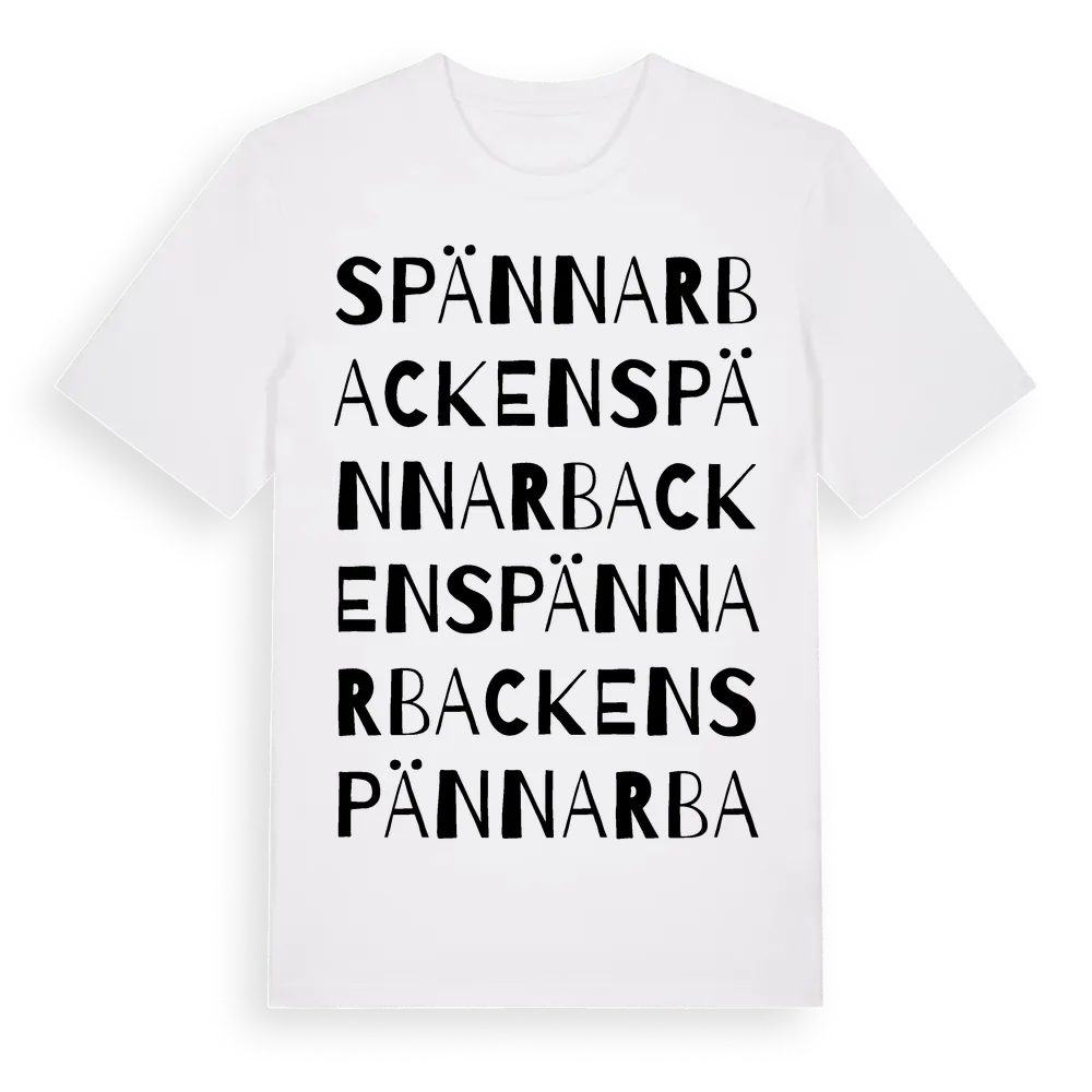 Spännarbacken ordlek t-shirt är inspirerad av Spännarbacken i Gävleborgs län, Sverige. Tröjan är designad för dig som har en speciell koppling till platsen – oavsett om du bor här, har rötterna här eller bara älskar Spännarbacken.