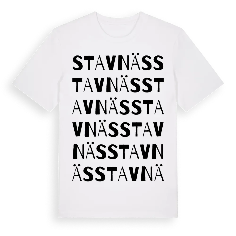 Stavnäs ordlek t-shirt är inspirerad av Stavnäs i Gävleborgs län, Sverige. Tröjan är designad för dig som har en speciell koppling till platsen – oavsett om du bor här, har rötterna här eller bara älskar Stavnäs.