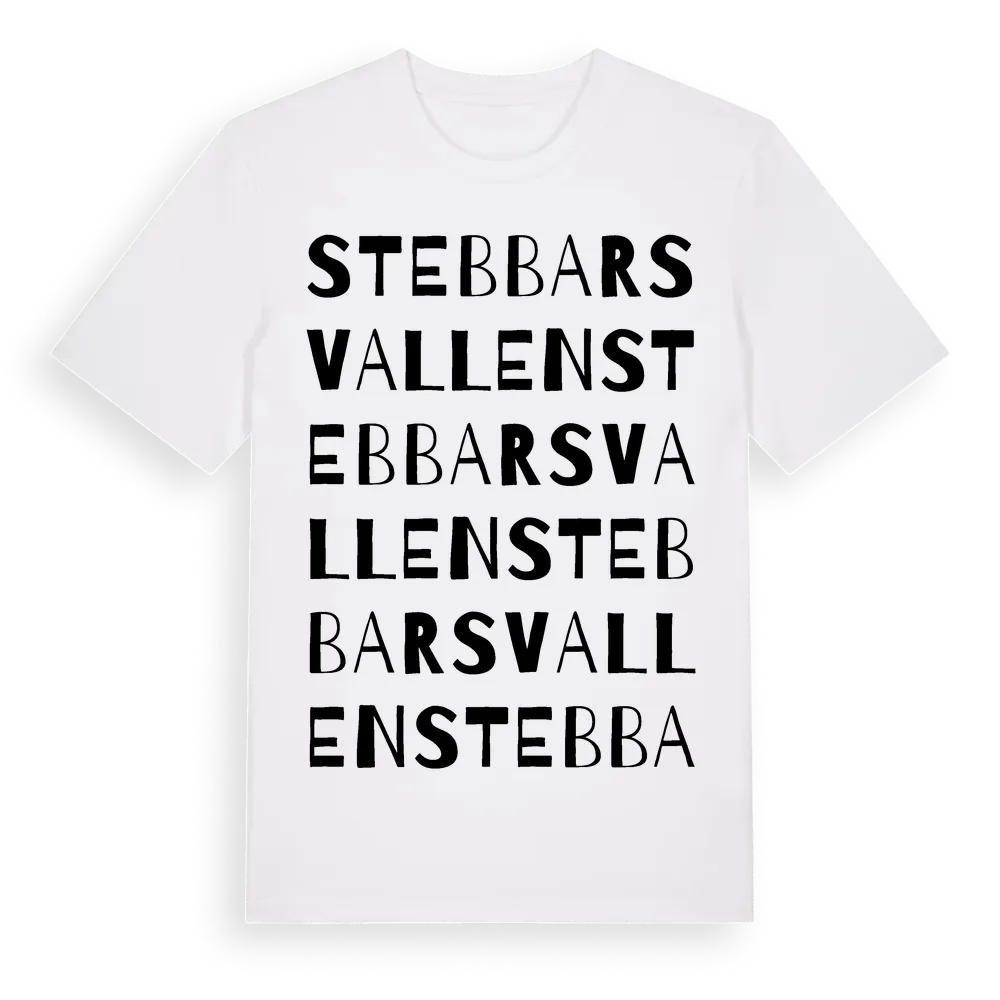 Stebbarsvallen ordlek t-shirt är inspirerad av Stebbarsvallen i Gävleborgs län, Sverige. Tröjan är designad för dig som har en speciell koppling till platsen – oavsett om du bor här, har rötterna här eller bara älskar Stebbarsvallen.