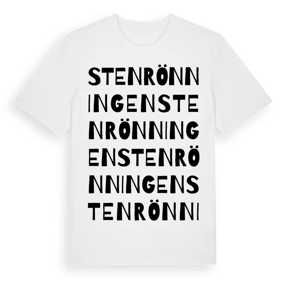 Stenrönningen ordlek t-shirt är inspirerad av byn Stenrönningen i Gävleborgs län, Sverige. Tröjan är designad för dig som har en speciell koppling till platsen – oavsett om du bor här, har rötterna här eller bara älskar Stenrönningen.