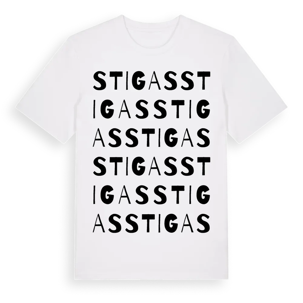 En ordlek byggd på Stigass namn. Subtilt och klurig – ett motiv som bara de som verkligen känner platsen fullt ut förstår. Premium bomull, unisex – från Stigas i Gävleborgs län.