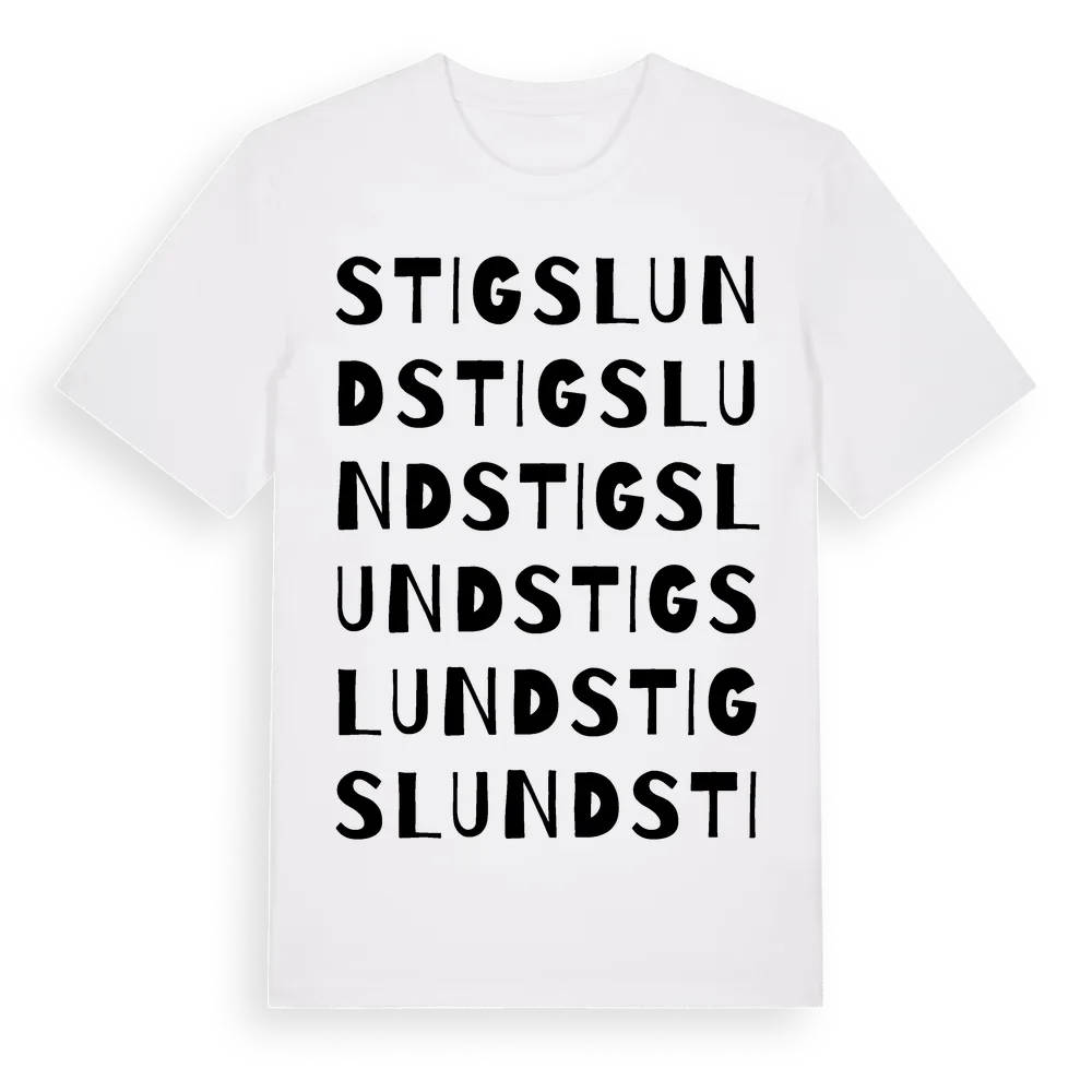 Stigslund ordlek t-shirt är inspirerad av stadsdelen Stigslund i Gävleborgs län, Sverige. Tröjan är designad för dig som har en speciell koppling till platsen – oavsett om du bor här, har rötterna här eller bara älskar Stigslund.