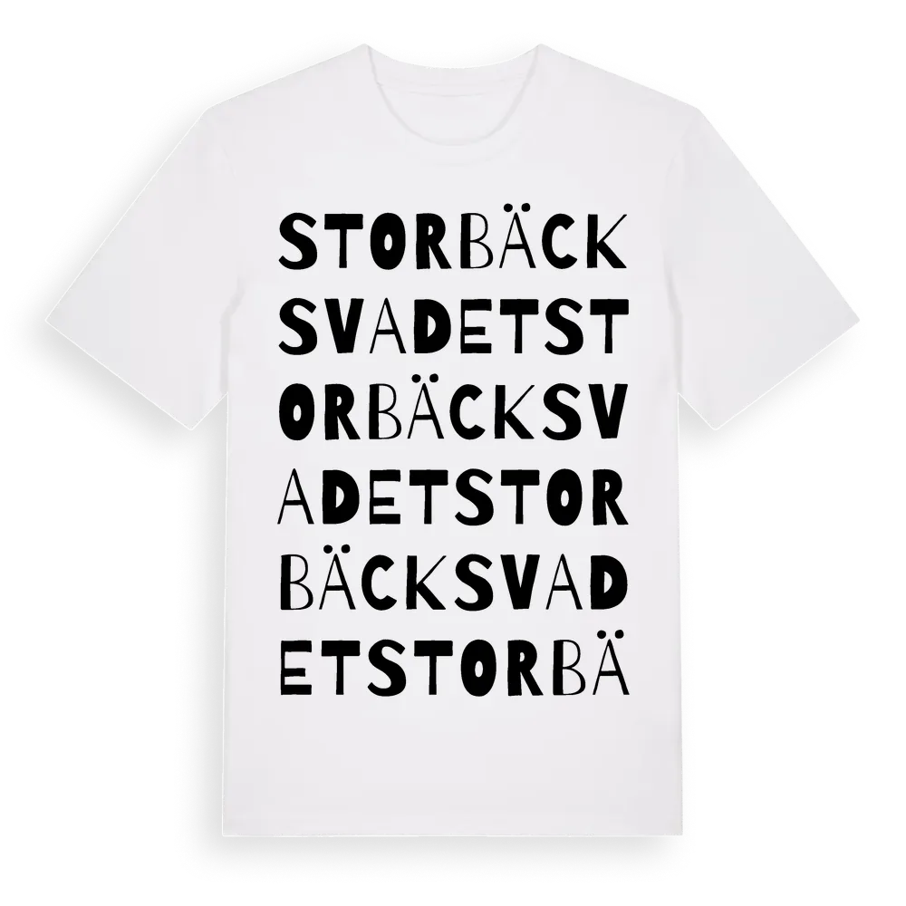 Storbäcksvadet ordlek t-shirt är inspirerad av Storbäcksvadet i Gävleborgs län, Sverige. Tröjan är designad för dig som har en speciell koppling till platsen – oavsett om du bor här, har rötterna här eller bara älskar Storbäcksvadet.