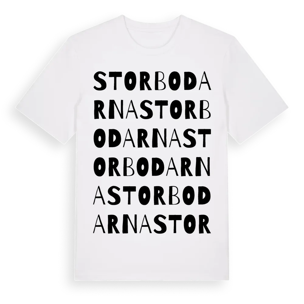 Storbodarna ordlek t-shirt är inspirerad av stadsdelen Storbodarna i Gävleborgs län, Sverige. Tröjan är designad för dig som har en speciell koppling till platsen – oavsett om du bor här, har rötterna här eller bara älskar Storbodarna.