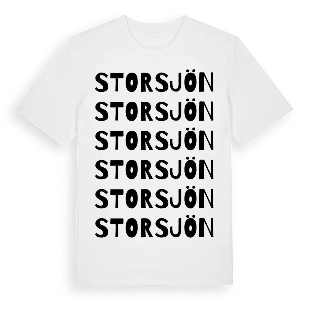 Storsjön ordlek t-shirt är inspirerad av byn Storsjön i Gävleborgs län, Sverige. Tröjan är designad för dig som har en speciell koppling till platsen – oavsett om du bor här, har rötterna här eller bara älskar Storsjön.