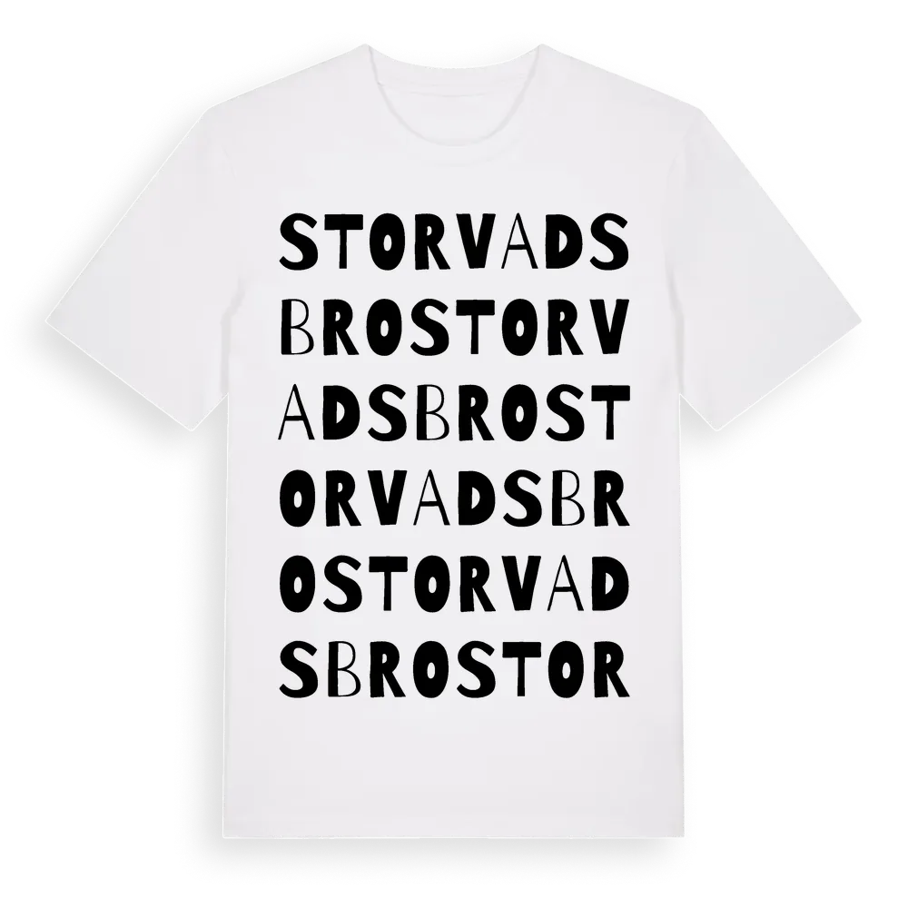 Storvadsbro ordlek t-shirt är inspirerad av byn Storvadsbro i Gävleborgs län, Sverige. Tröjan är designad för dig som har en speciell koppling till platsen – oavsett om du bor här, har rötterna här eller bara älskar Storvadsbro.