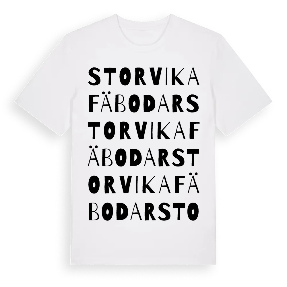Storvika Fäbodar ordlek t-shirt är inspirerad av Storvika Fäbodar i Gävleborgs län, Sverige. Tröjan är designad för dig som har en speciell koppling till platsen – oavsett om du bor här, har rötterna här eller bara älskar Storvika Fäbodar.