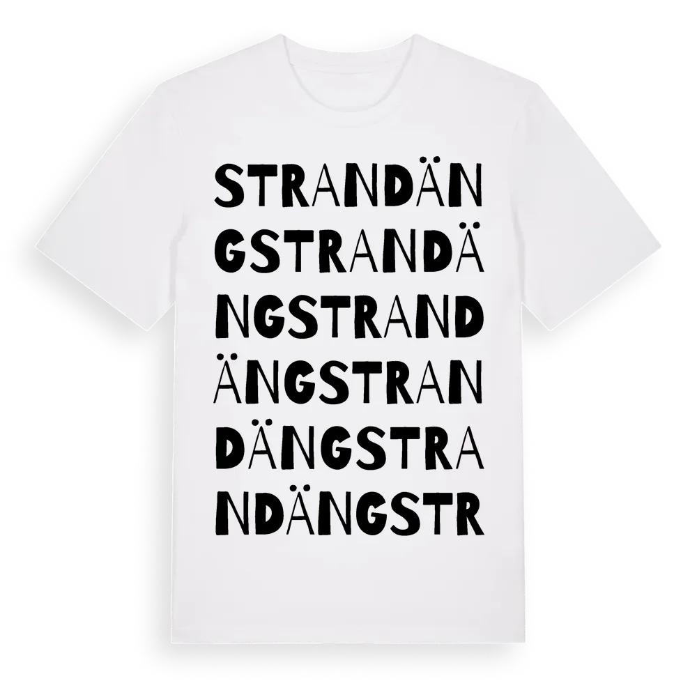Strandäng ordlek t-shirt är inspirerad av byn Strandäng i Gävleborgs län, Sverige. Tröjan är designad för dig som har en speciell koppling till platsen – oavsett om du bor här, har rötterna här eller bara älskar Strandäng.