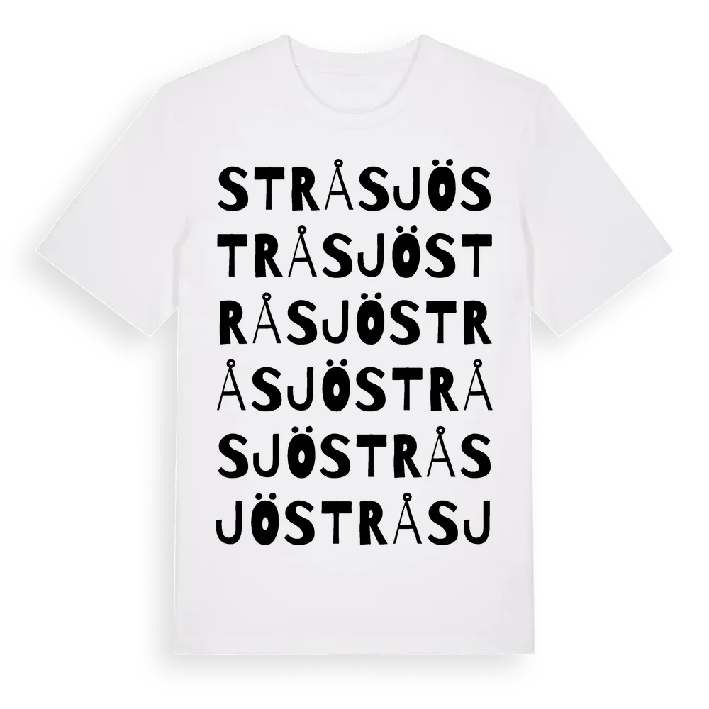 Stråsjö ordlek t-shirt är inspirerad av byn Stråsjö i Gävleborgs län, Sverige. Tröjan är designad för dig som har en speciell koppling till platsen – oavsett om du bor här, har rötterna här eller bara älskar Stråsjö.