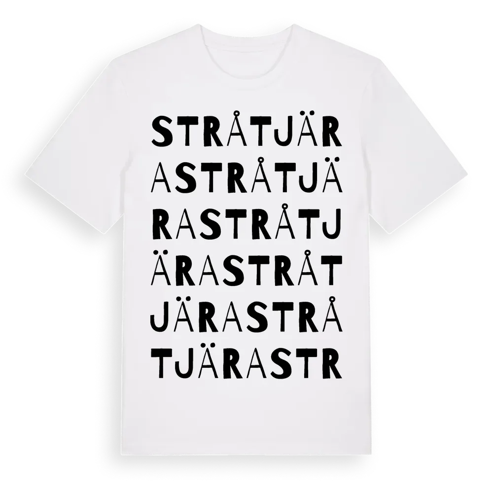 Stråtjära ordlek t-shirt är inspirerad av byn Stråtjära i Gävleborgs län, Sverige. Tröjan är designad för dig som har en speciell koppling till platsen – oavsett om du bor här, har rötterna här eller bara älskar Stråtjära.