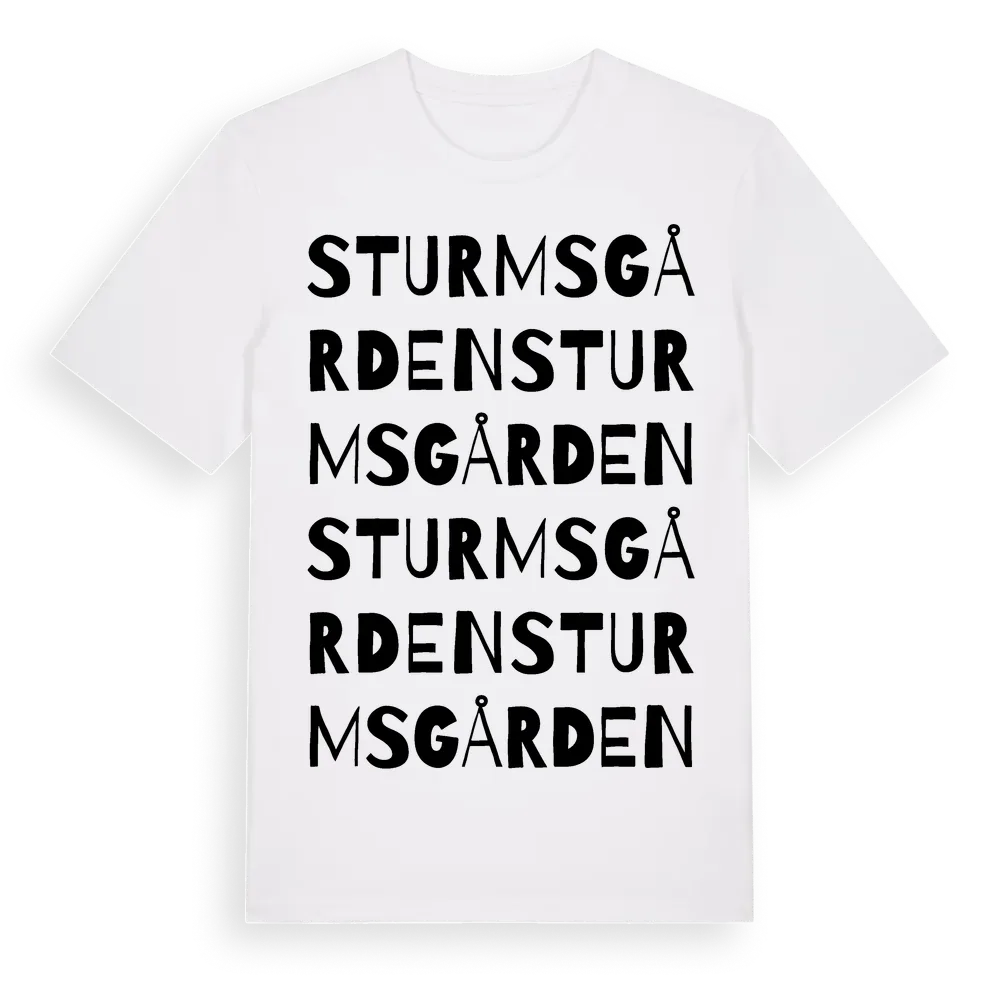 Sturmsgården ordlek t-shirt är inspirerad av Sturmsgården i Gävleborgs län, Sverige. Tröjan är designad för dig som har en speciell koppling till platsen – oavsett om du bor här, har rötterna här eller bara älskar Sturmsgården.