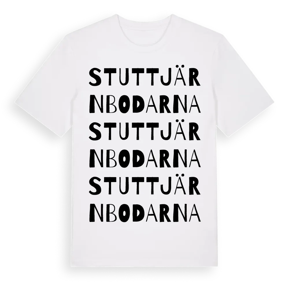 Stuttjärnbodarna ordlek t-shirt är inspirerad av Stuttjärnbodarna i Gävleborgs län, Sverige. Tröjan är designad för dig som har en speciell koppling till platsen – oavsett om du bor här, har rötterna här eller bara älskar Stuttjärnbodarna.