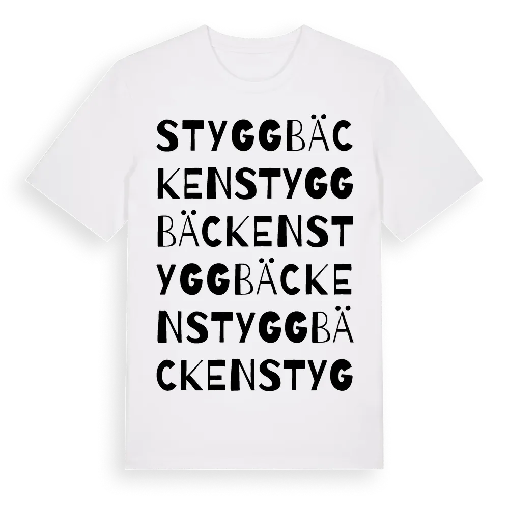 Styggbäcken ordlek t-shirt är inspirerad av Styggbäcken i Gävleborgs län, Sverige. Tröjan är designad för dig som har en speciell koppling till platsen – oavsett om du bor här, har rötterna här eller bara älskar Styggbäcken.