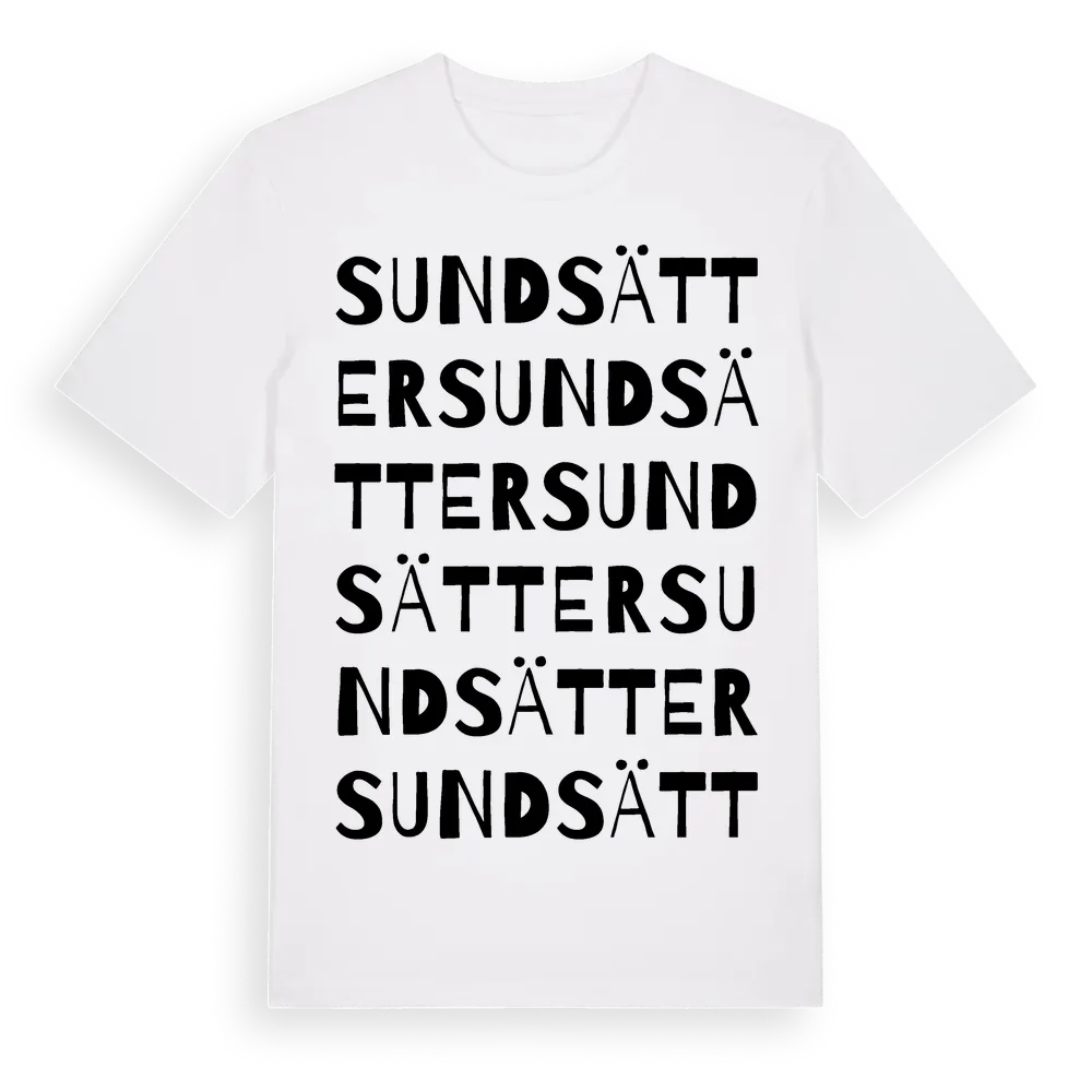 Sundsätter ordlek t-shirt är inspirerad av byn Sundsätter i Gävleborgs län, Sverige. Tröjan är designad för dig som har en speciell koppling till platsen – oavsett om du bor här, har rötterna här eller bara älskar Sundsätter.