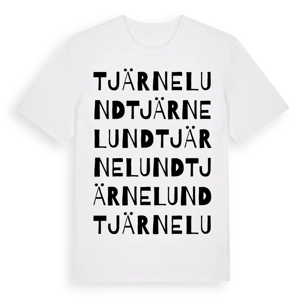 Tjärnelund ordlek t-shirt är inspirerad av byn Tjärnelund i Gävleborgs län, Sverige. Tröjan är designad för dig som har en speciell koppling till platsen – oavsett om du bor här, har rötterna här eller bara älskar Tjärnelund.