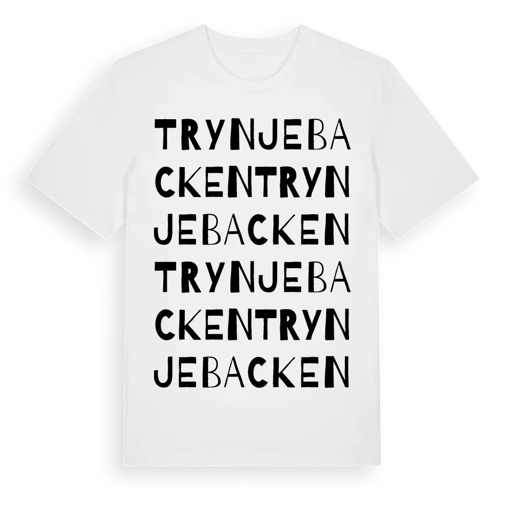 En ordlek byggd på Trynjebackens namn. Subtilt och klurig – ett motiv som bara de som verkligen känner platsen fullt ut förstår. Premium bomull, unisex – från Trynjebacken i Gävleborgs län.