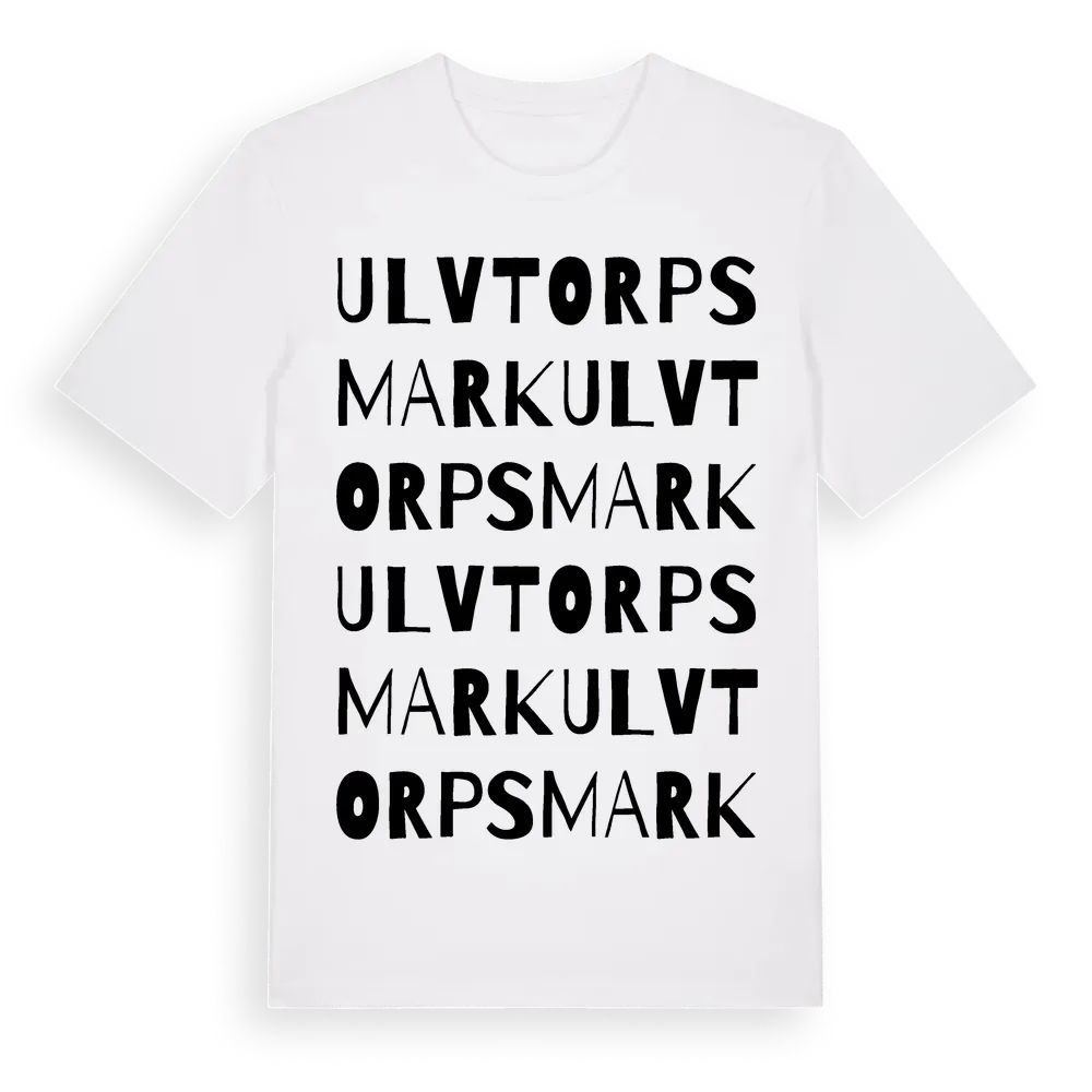 Ulvtorpsmark ordlek t-shirt är inspirerad av Ulvtorpsmark i Gävleborgs län, Sverige. Tröjan är designad för dig som har en speciell koppling till platsen – oavsett om du bor här, har rötterna här eller bara älskar Ulvtorpsmark.