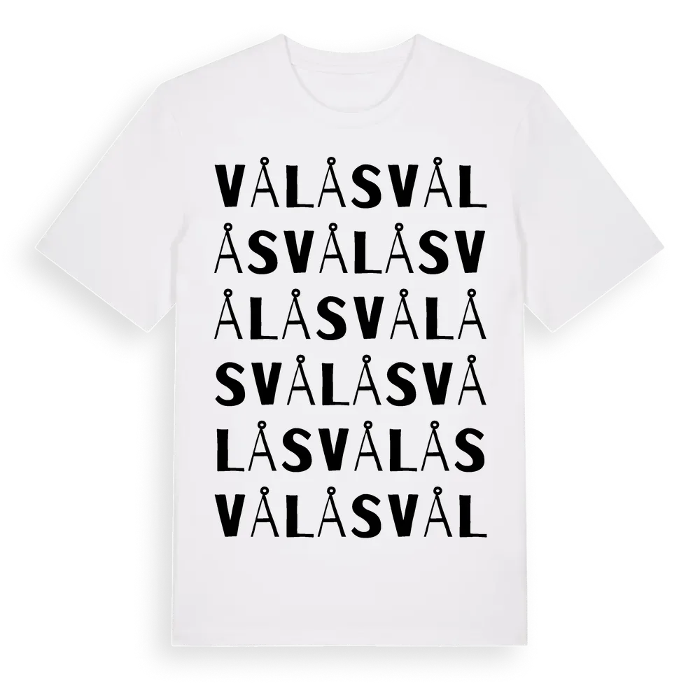 En ordlek byggd på Vålåss namn. Subtilt och klurig – ett motiv som bara de som verkligen känner platsen fullt ut förstår. Premium bomull, unisex – från Vålås i Gävleborgs län.