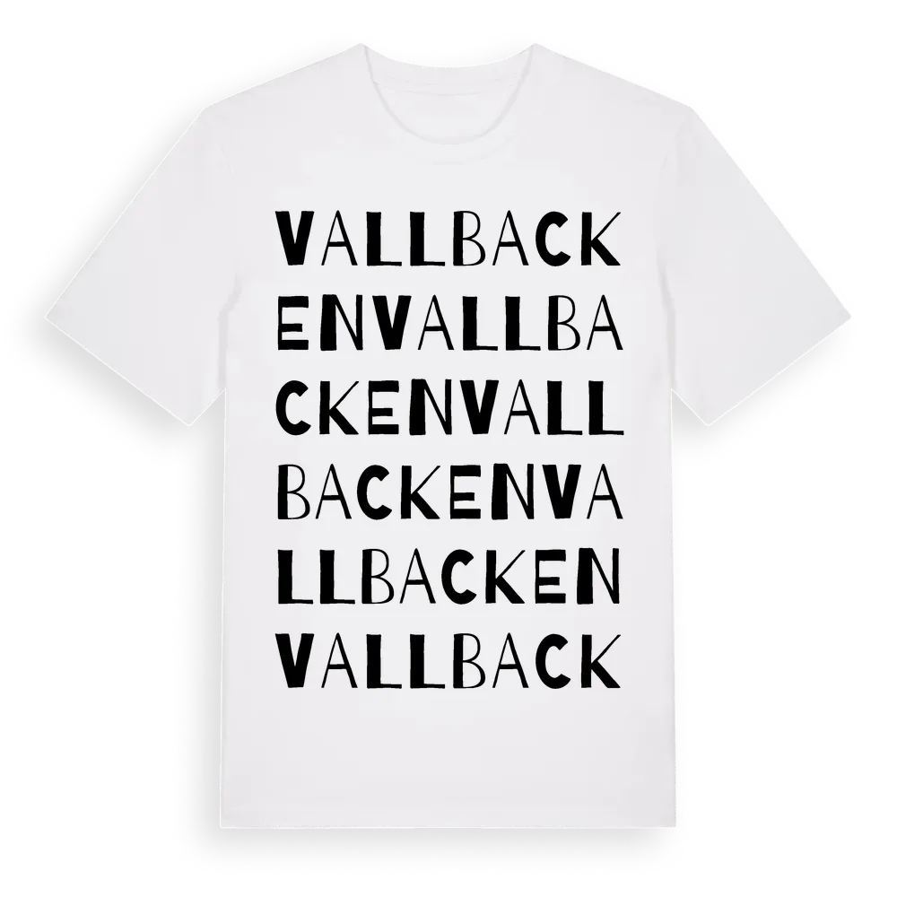 Vallbacken ordlek t-shirt är inspirerad av Vallbacken i Gävleborgs län, Sverige. Tröjan är designad för dig som har en speciell koppling till platsen – oavsett om du bor här, har rötterna här eller bara älskar Vallbacken.