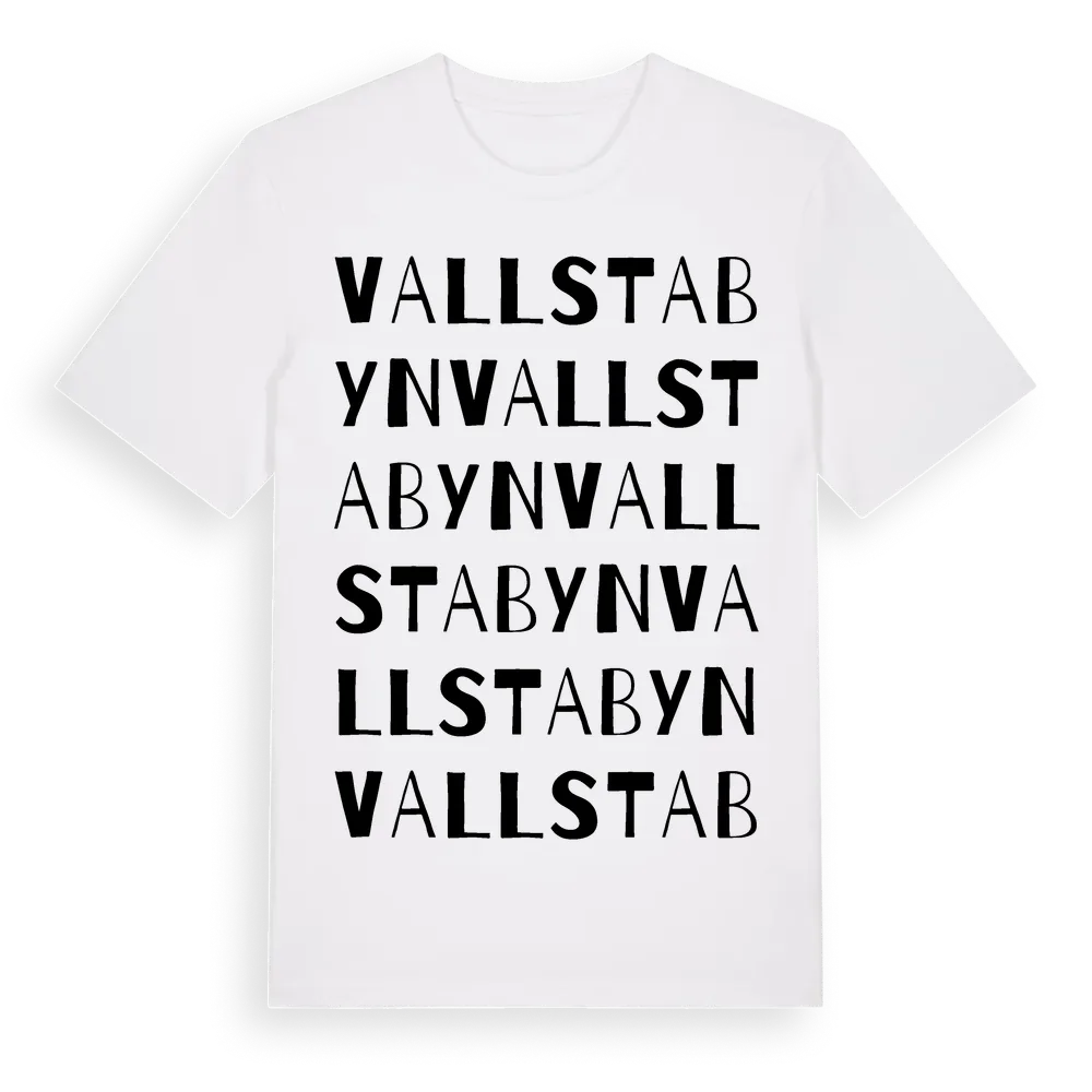 Vallstabyn ordlek t-shirt är inspirerad av byn Vallstabyn i Gävleborgs län, Sverige. Tröjan är designad för dig som har en speciell koppling till platsen – oavsett om du bor här, har rötterna här eller bara älskar Vallstabyn.