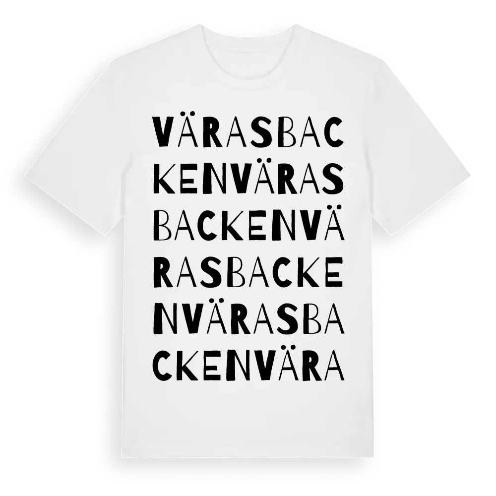 Värasbacken ordlek t-shirt är inspirerad av Värasbacken i Gävleborgs län, Sverige. Tröjan är designad för dig som har en speciell koppling till platsen – oavsett om du bor här, har rötterna här eller bara älskar Värasbacken.