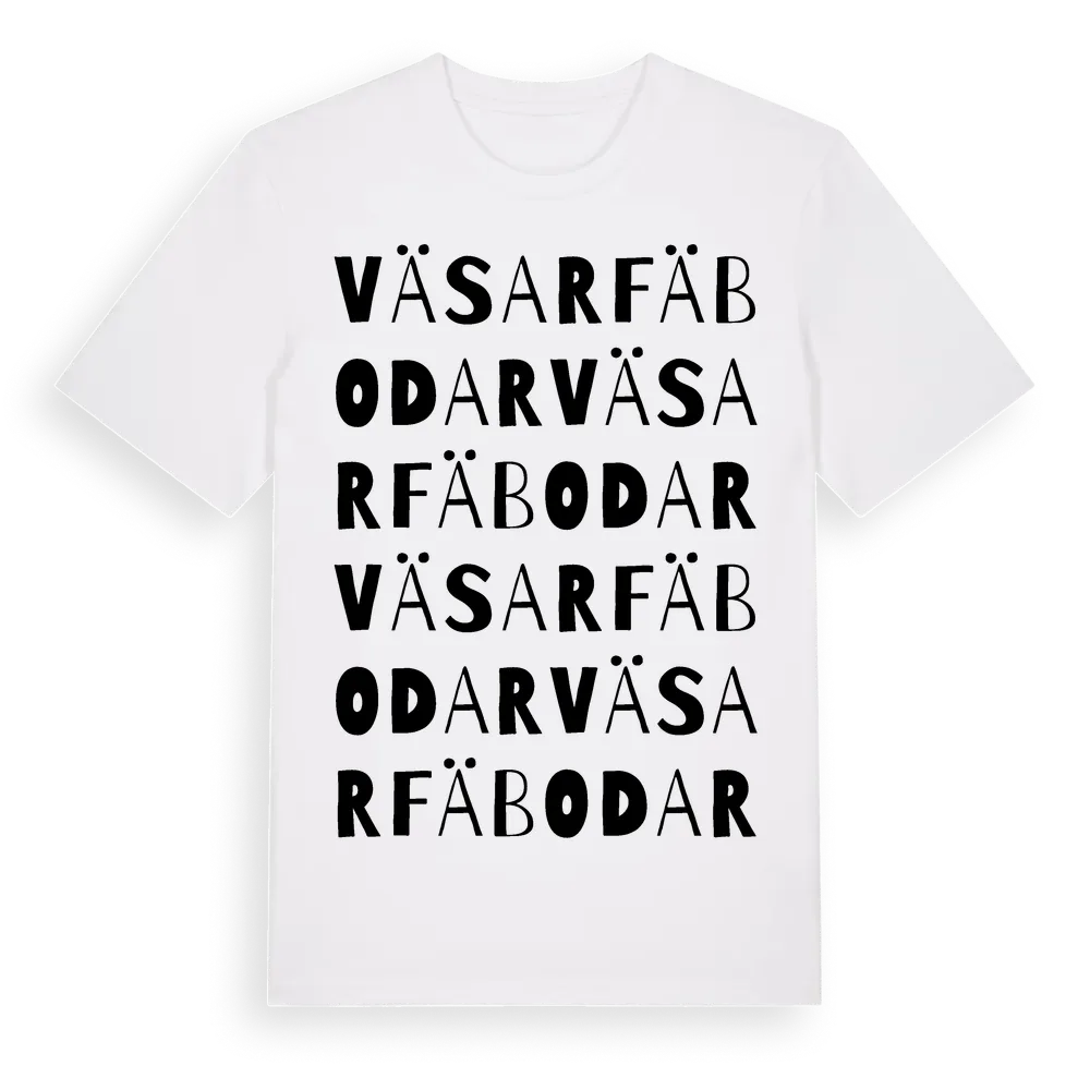Väsar Fäbodar ordlek t-shirt är inspirerad av Väsar Fäbodar i Gävleborgs län, Sverige. Tröjan är designad för dig som har en speciell koppling till platsen – oavsett om du bor här, har rötterna här eller bara älskar Väsar Fäbodar.
