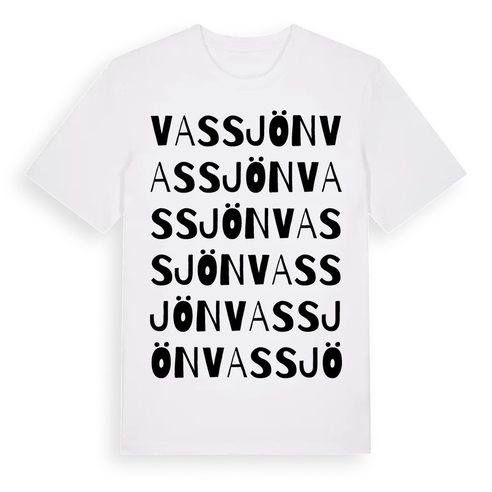 Vassjön ordlek t-shirt är inspirerad av Vassjön i Gävleborgs län, Sverige. Tröjan är designad för dig som har en speciell koppling till platsen – oavsett om du bor här, har rötterna här eller bara älskar Vassjön.