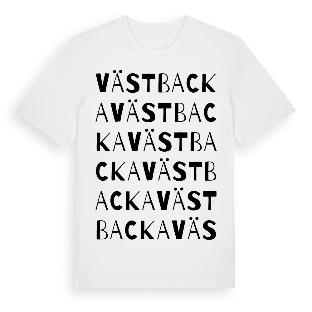 Västbacka ordlek t-shirt är inspirerad av Västbacka i Gävleborgs län, Sverige. Tröjan är designad för dig som har en speciell koppling till platsen – oavsett om du bor här, har rötterna här eller bara älskar Västbacka.