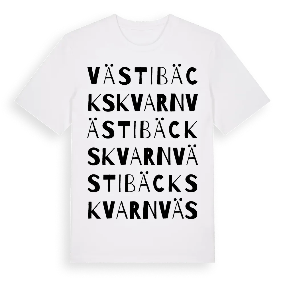 Västibäckskvarn ordlek t-shirt är inspirerad av Västibäckskvarn i Gävleborgs län, Sverige. Tröjan är designad för dig som har en speciell koppling till platsen – oavsett om du bor här, har rötterna här eller bara älskar Västibäckskvarn.